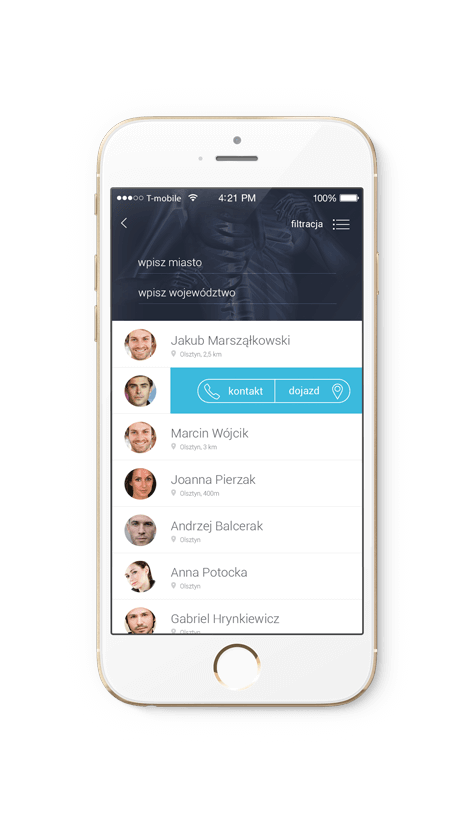 Naszym zadaniem było opracowanie aplikacji mobilnej, dającej możliwość szybkiej rejestracji wizyty u najbliższego fizjoterapeuty/lekarza.