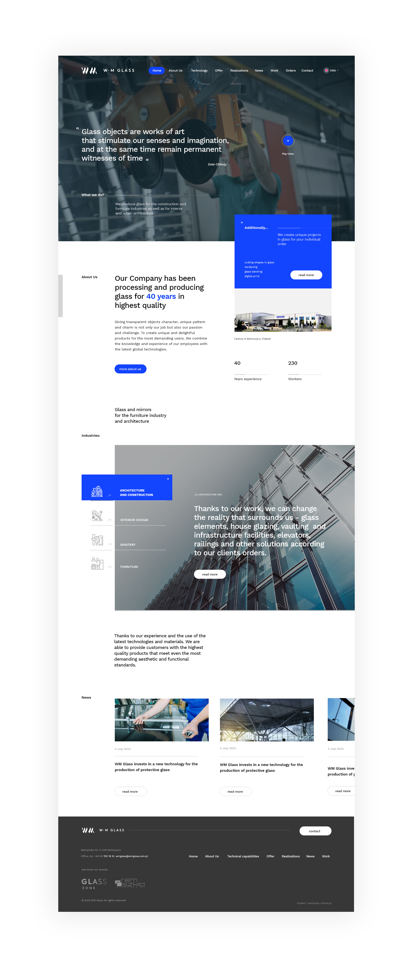 Projekt strony internetowej dla firmy "W-M Glass" miał na celu stworzenie atrakcyjnej, funkcjonalnej i profesjonalnej platformy online, która będzie efektywnie prezentować ofertę i osiągnięcia firmy, zachęcając potencjalnych klientów i partnerów biznesowych do współpracy oraz budując jej markę jako lidera w branży szklarskiej. Zastosowaliśmy odpowiednie technologie i podejście do designu oraz treści, dzięki czemu strona stanowi ważne narzędzie wsparcia biznesowego i komunikacyjnego dla "W-M Glass".