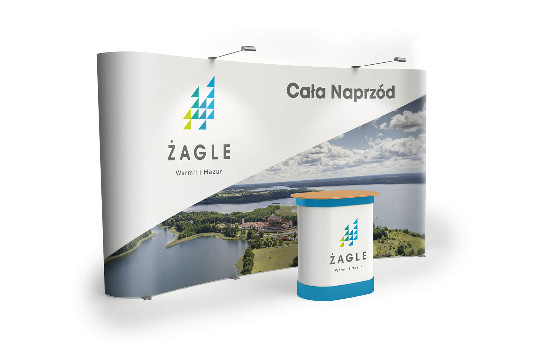 Piorytetem przy tworzeniu identyfikacji wizualnej było nawiązanie do tematyki żeglarstwaniezwykle charakterystycznej dla regionu Warmii i Mazur. W proponowanym przez nas projekcie możemy zauważyć wizerunek kecza, nowoczesnego żaglowca