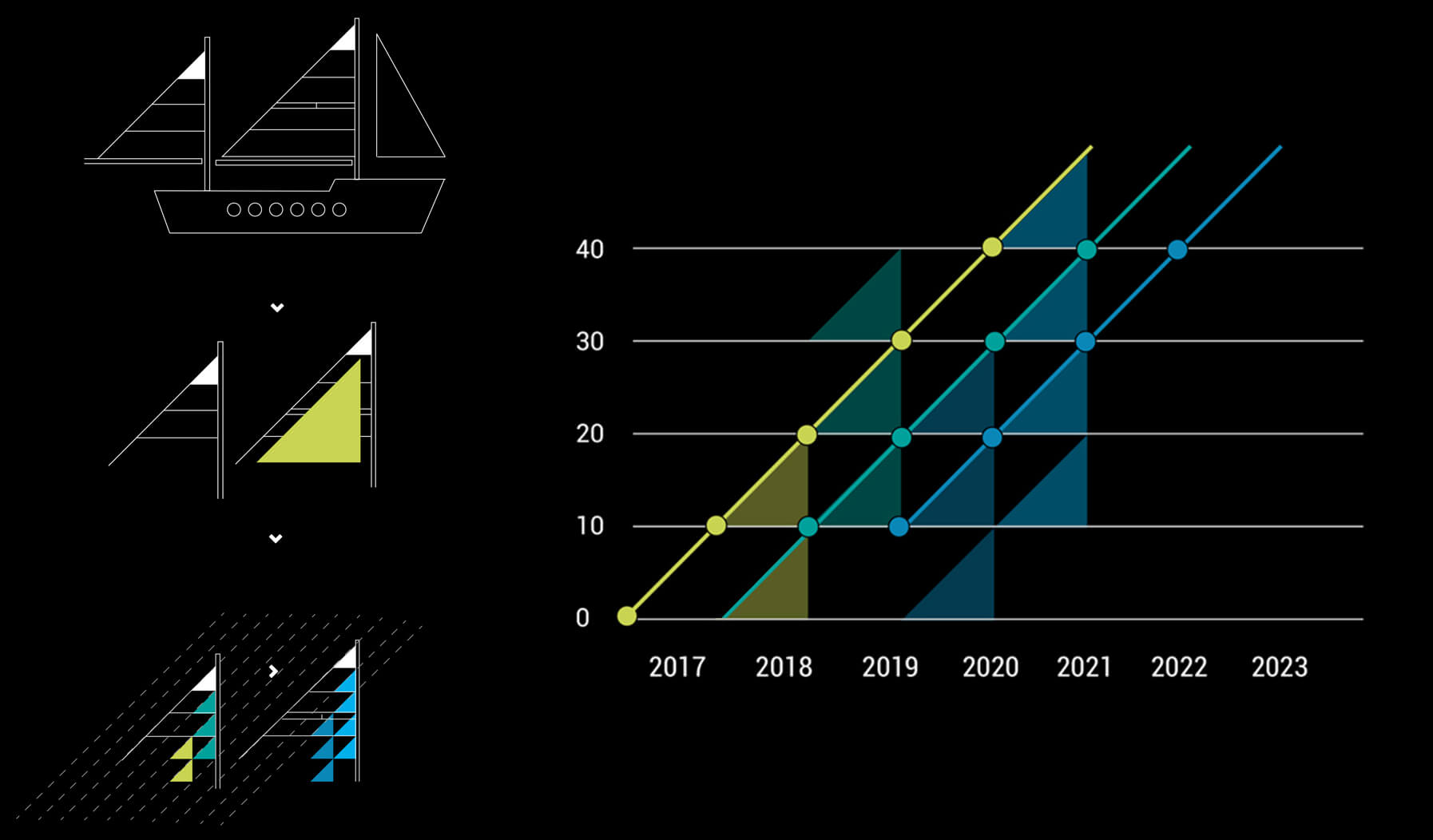 Układ trójkątów (żagli) odnosi się również do tendencji rozwojowej przedsiębioratw przedstawionej za pomocą wykresów liniowych. sąsiadujące trójkąty (żagle) symbolizują wzajemną współprace i zdrową konkurencję.